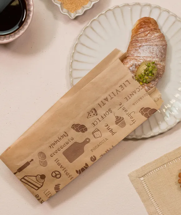 For croissants packed with creams or jams, krapfens, pancakes and all delicious baked products, Esseoquattro offers greaseproof bags made of natural havana, black or white kraft.