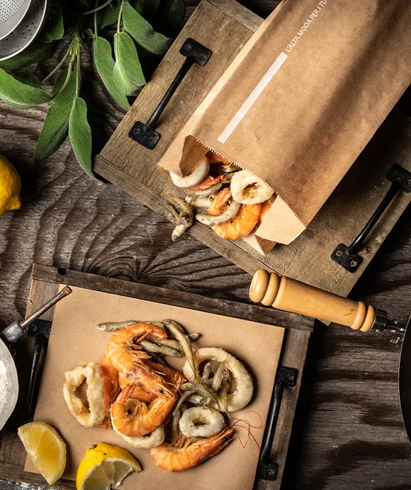 Regarding fried food such as vegetables, fish or traditional arancini (Italian deep-fried stuffed rice balls), you can pour food from your fryer basket on our Olà paper to drain the first oil and then make a unique plating by using our paper as a support for chopping boards, as over-dish mats or to make the traditional cuoppo (Neapolitan paper cone).